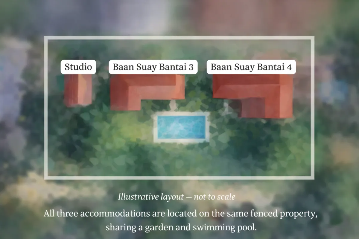 Our most popular group configuration combines Baan Suay Bantai 3 & 4, with a Studio Bungalow as an optional add-on.